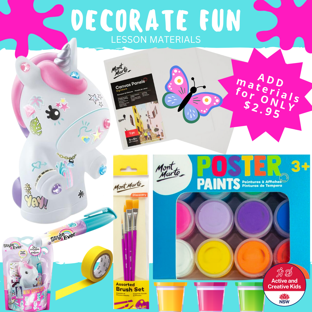 OPTIONAL ADD ON Lesson Materials $2.95 Pack Includes: Monte Marte Poster Paints, Paintbrush 4pc, Canvas x 2, Washi Tape, Mini Deco DIY Light and Unpainted Wooden Butterfly.