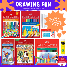 OPTIONAL: ADD ON Lesson Materials $2.95 Pack Includes Faber-Castell Fibre Tip Colour Markers 12 pack or Connector Pens 10 pack, Faber Castell 12 Watercolour Pencils PLUS Paintbrush, Faber-Castell Colouring Book, Faber Castell 12 Jumbo or Junior Triangular Twist Colour Crayons, Faber Castell 12 Colour Pencils, Glue, Sharpener, Cards and Envelopes.