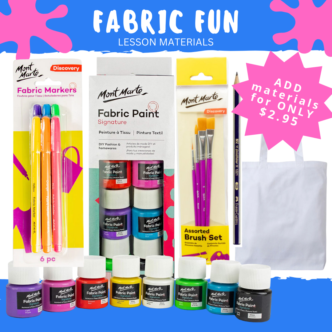 OPTIONAL: ADD ON $2.95 Lesson Materials Pack Includes: Mont Marte Fabric Markers - 6pc, Mont Marte Fabric Paint Set - 8pc, Mont Marte Paintbrushes -4pc, Led Pencil, 1x Canvas Tote Bag, 1 x Black Outline Design,