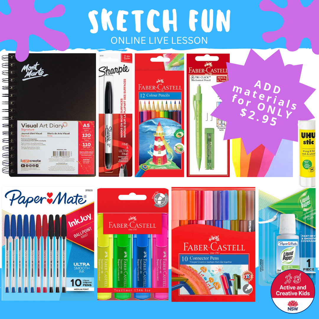 OPTIONAL: ADD ON $2.95 Lesson Materials Pack Includes: Mont Marte Visual Art Diary A5, Faber Castell Coloured Pencils - 12, Black Sharpie, UHU Glue, Faber Castell Mechanical Pencil, Sharpie Fluo XL Highlighters, Papermate InkJoy Pens - 10pk, Faber Castell - Connector Pens - 10pk, Papermate Liquid Paper or Correction Tape, Coloured Paper - 2.